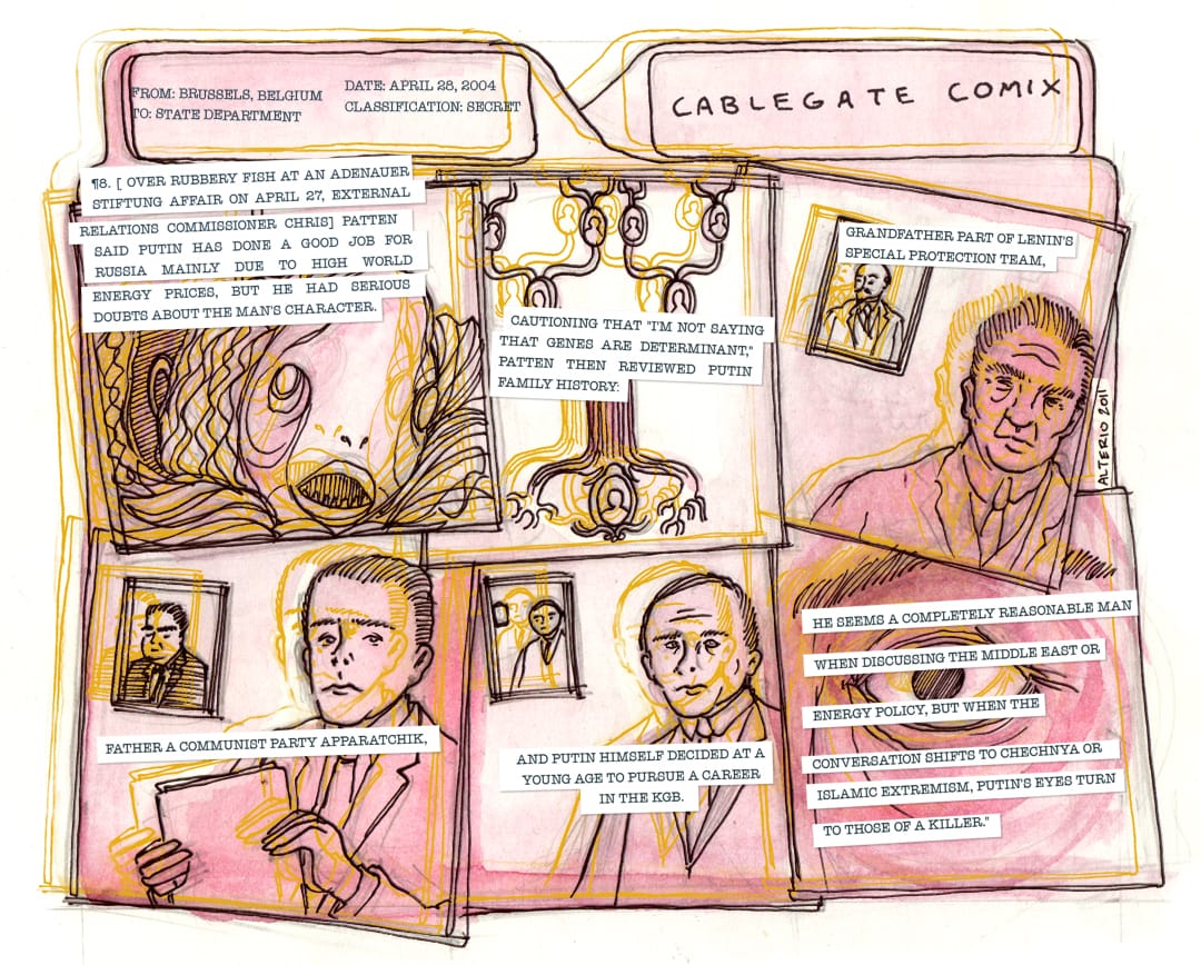 When the Panama Papers and Cablegate ooccured in 2010, it hit a few of my sweet spots: national security scuttlebutt, diplomatic craft, and micro-narratives. Regardless of what you think of Wikileaks, the ability to a civie to peruse at leisure hundreds of formerly secret diplomatic cables was too sweet to pass up. Originally published for HiloBrow, and then for The Atlantic, my weird little scratchy comics were in front of movers and shakers in Washington for a few days. It was a weird feeling.